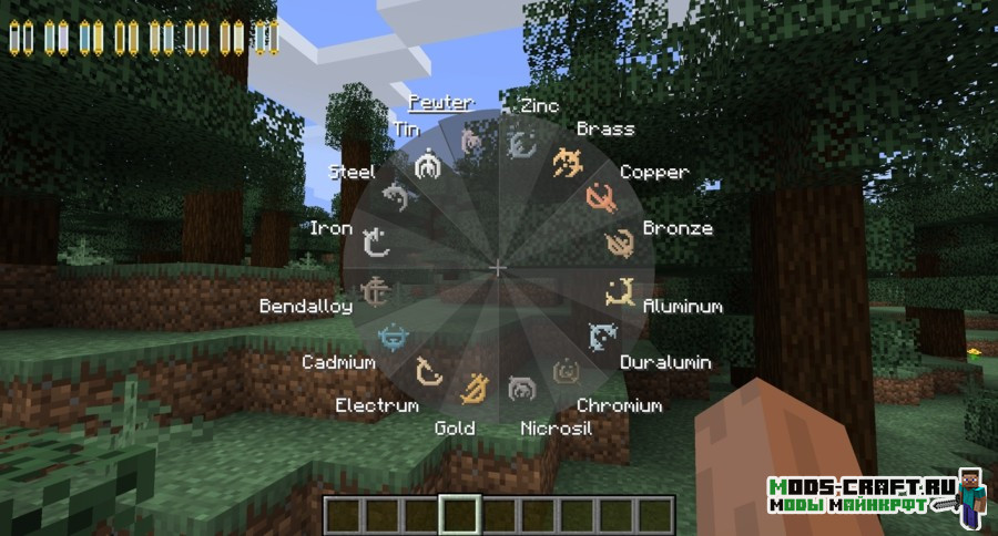 С помощью мода Allomancy вы сможете поглощать энергию металлов, улучшая характеристики своего персонажа. Меню эффектов от металлов можно открыть на клавишу F, лучше её изменить, т.к. это клавиша для перемещения предмета в другую руку.