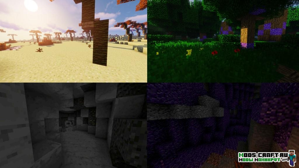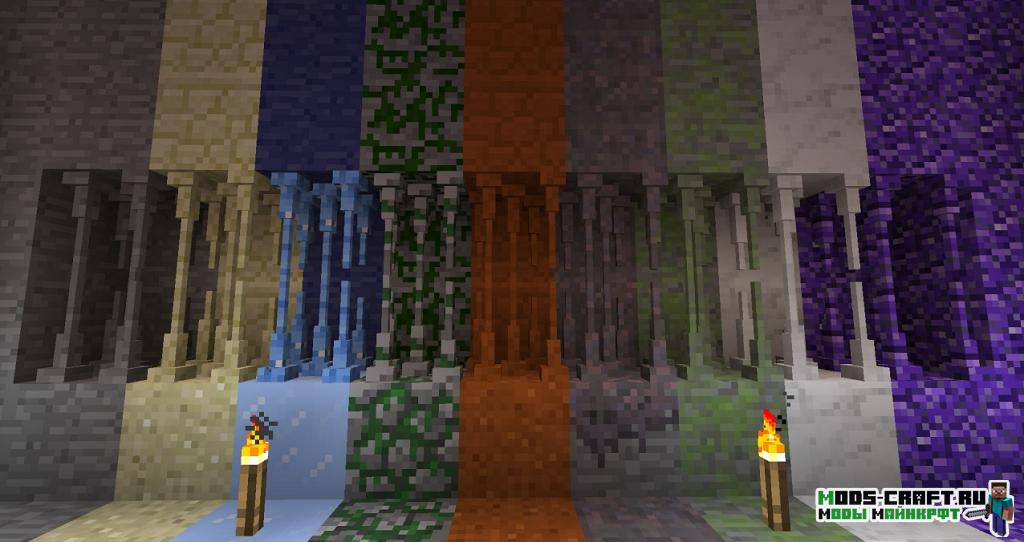 Мод делает пещеры в Майнкрафт более интересными для изучения игроками — добавит новые их типы и пару генерируемых данжей, новые биомы, 2 новых типа камня (мрамор и пурпурный гранит), появятся новые пещерные мобы — скорпионы, а также 3 новых дальнобойных оружия (ядовитые палочки).