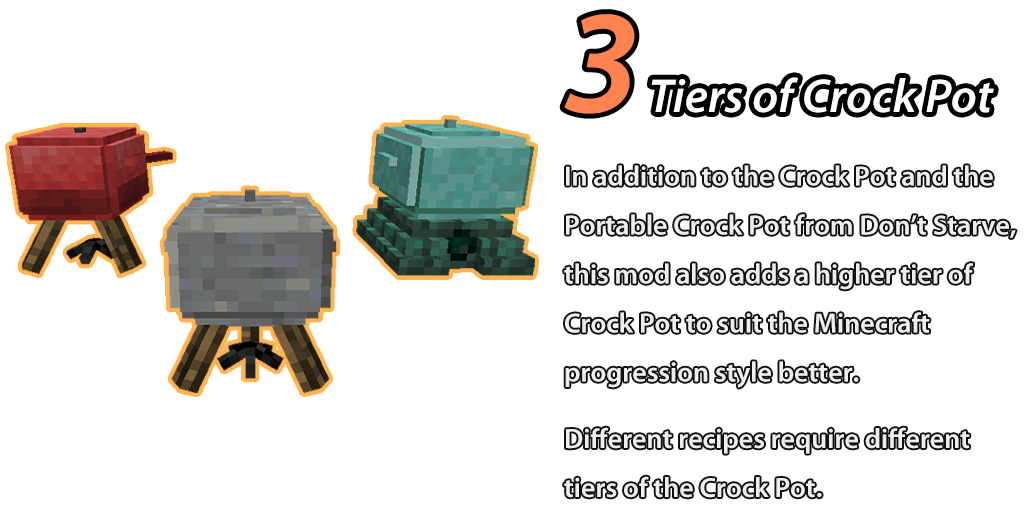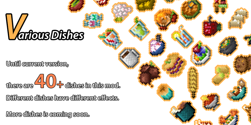 Модификация добавит в игру различные виды казанов, аналогичные тем, которые можно встретить в игре Don’t Starve. Эти казаны позволят игроку приготовить более сорока новых блюд и напитков, каждый из которых будет иметь уникальные эффекты и свойства.