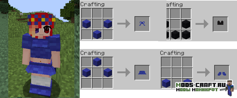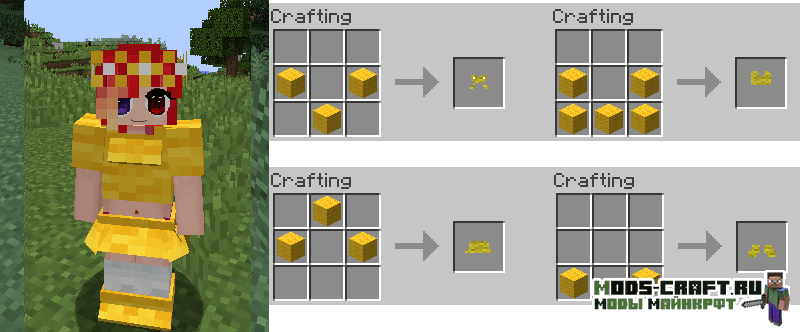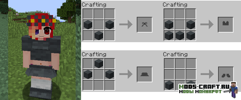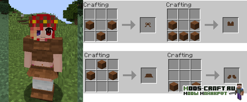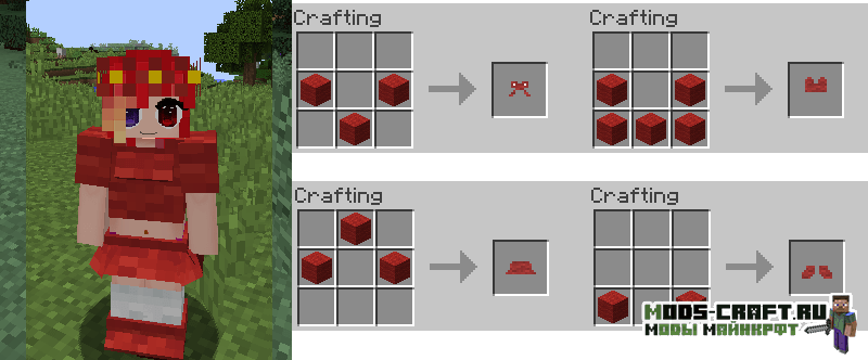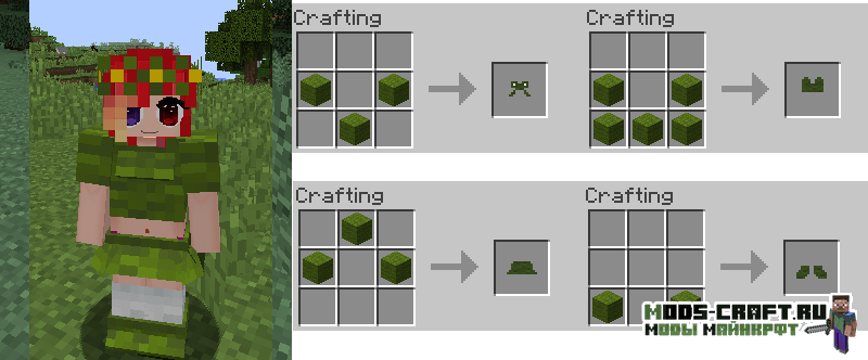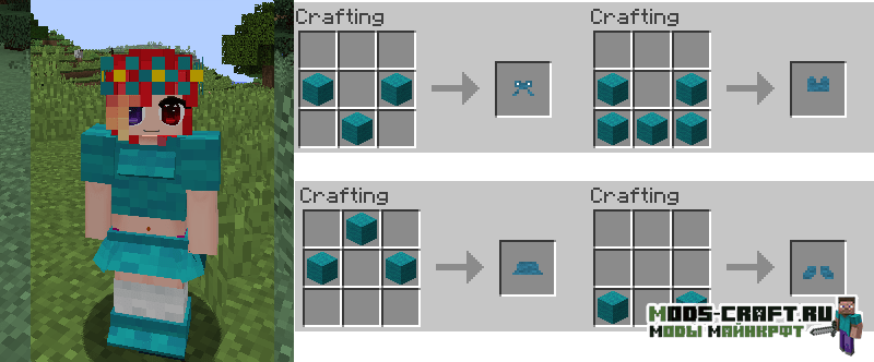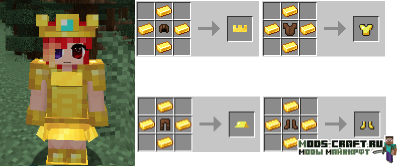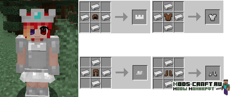 Girl Armor добавляет женские версии алмазной, золотой, железной и кожаной брони, которые выглядит как платья, но обладают такими же защитными свойствами. Так же вы сможете изготовить красивые наряды из ткани и шерсти с различными узорами и костюмами животных.