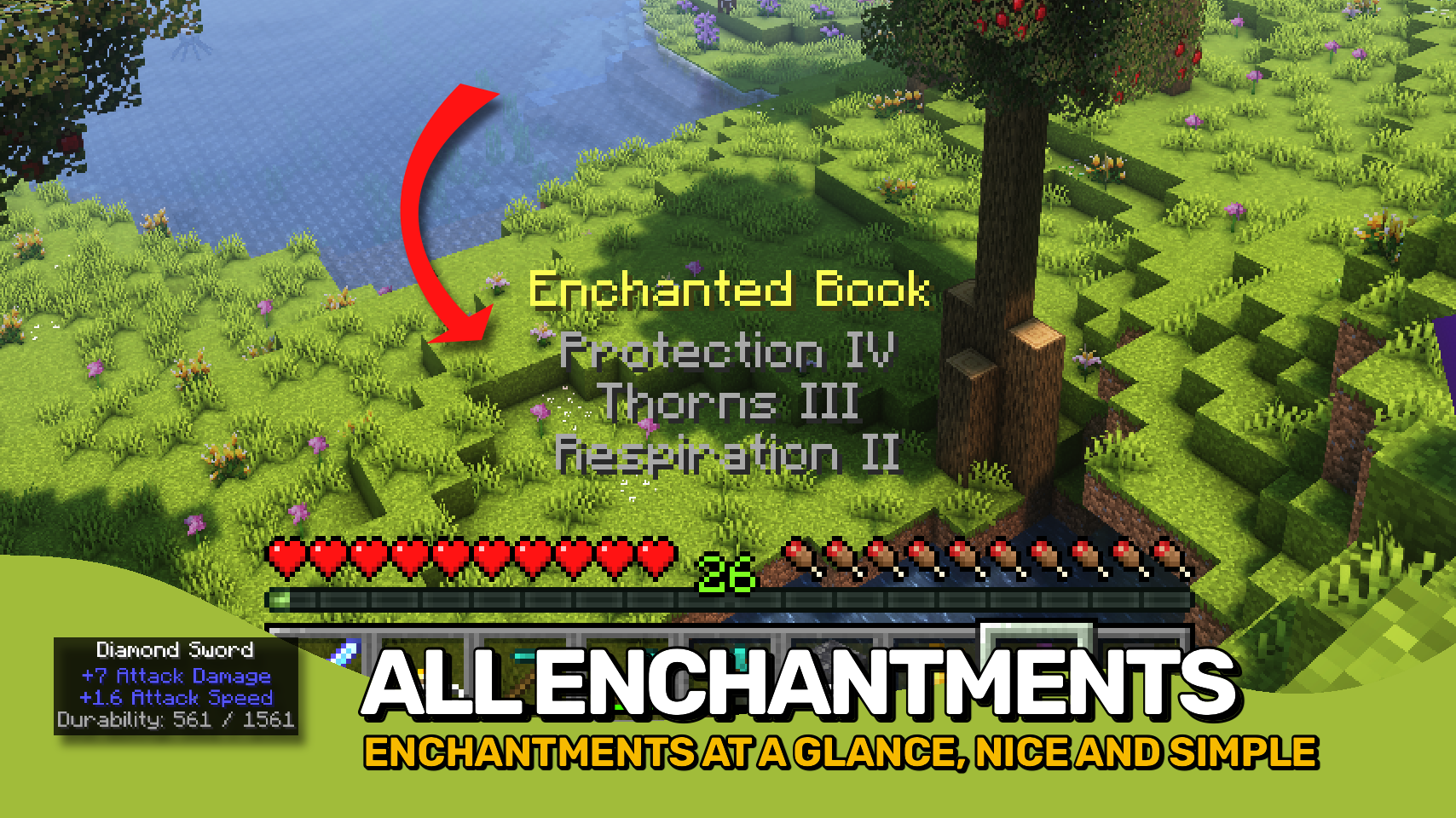 - Расширенные подсказки над хотбаром. Мод добавляет всплывающие подсказки, которые содержат информацию о долговечности инструмента, зачарованиях, эффектах зелий и многом другом. Таким образом, вы всегда будете в курсе характеристик ваших предметов.