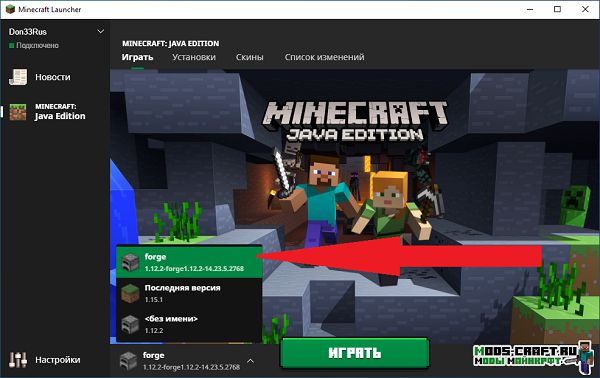 Дальнейшим шагом будет запуск лаунчера Майнкрафт, я использую лицензионный лаунчер, на пиратской версии будет всё схоже. В лаунчере необходимо выбрать нашу версию с форджем. Далее нажать кнопку «Играть». Пройдёт некоторое время и игра будет запущена.