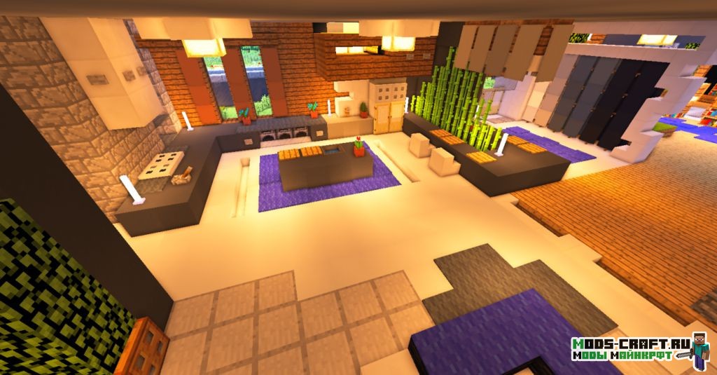 Кроме этого сделаны и сложные механизмы с использованием редстоуна, которые смогут убить даже самых умных и хитрых. В самом здании неплохо сделан интерьер в стиле модерна, жить в таком доме одно удовольствие. Рекомендуем использовать встроенный ресурспак карты (ссылка на скачивание ниже).