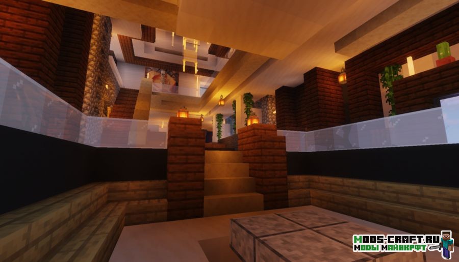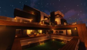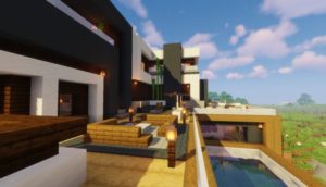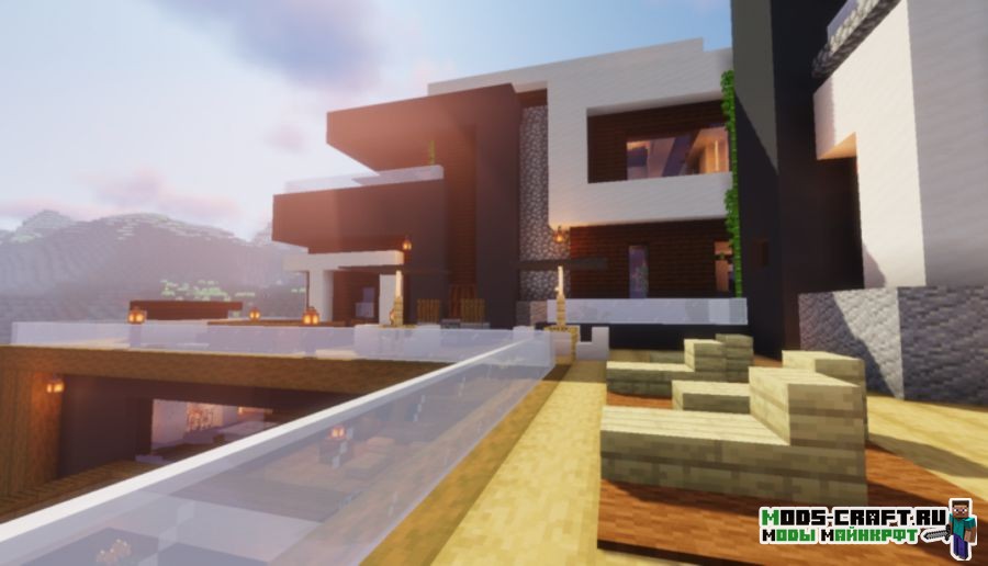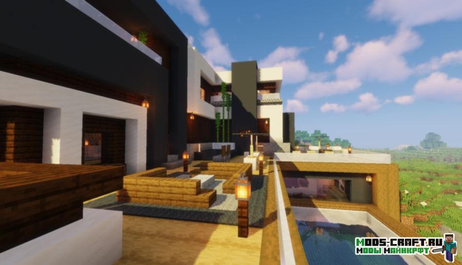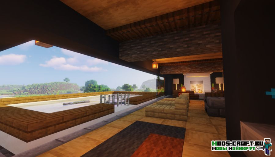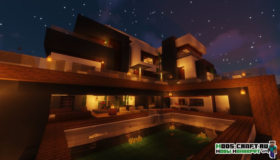 Очень красивый небольшой домик с бассейном в современном стиле сохраняет все принципы ванильной версии и не нарушает баланс цветов. Внутри довольно уютненько и светло, автор поработал над освещением дома. Обязательно посетите балкон и насладитесь отличным видом на берег реки из панорамных окон.
