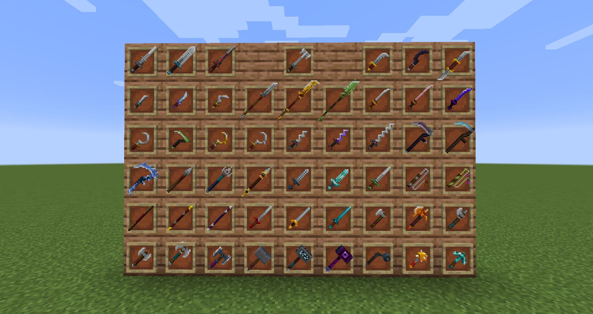 Множество нового оружия у вас появится с модом MC Dungeons Weaponry, которое будет спрятано в сундуках разных данжей (ответвлений игры). Каждое будет обладать уникальным внешним видом, у части из них будут эффекты или способности (например, замедление, высасывание здоровья, оглушение, притягивание молнии, отравление и так далее). Всего их будет 43 штуки, среди них серпы, катаны, мечи, копья, косы, боевые двойные топоры, палица.