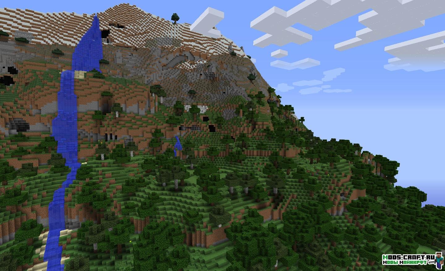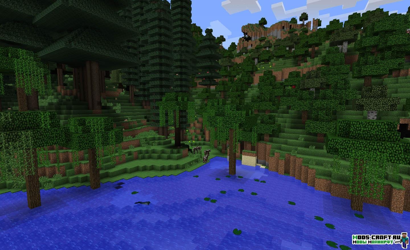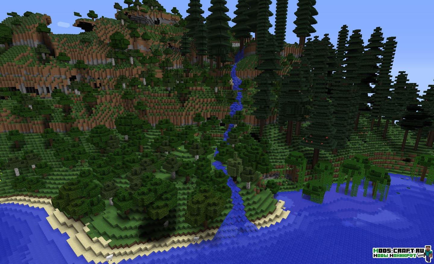 Очень интересный мод под смыслом «Альтернативная генерация». Он полностью заменяет ванильную генерацию мира Майнкрафт на свою собственную, изменённую полностью.