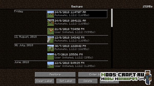 Мод будет автоматически создавать резервную копию играемого мира каждые 15 минут и хранить их в специальном формате для экономии места на диске, а старые версии постепенно подчищаться. Через специальный графический интерфейс можно легко управлять резервными копиями миров: восстанавливать, удалять и перемещать.
