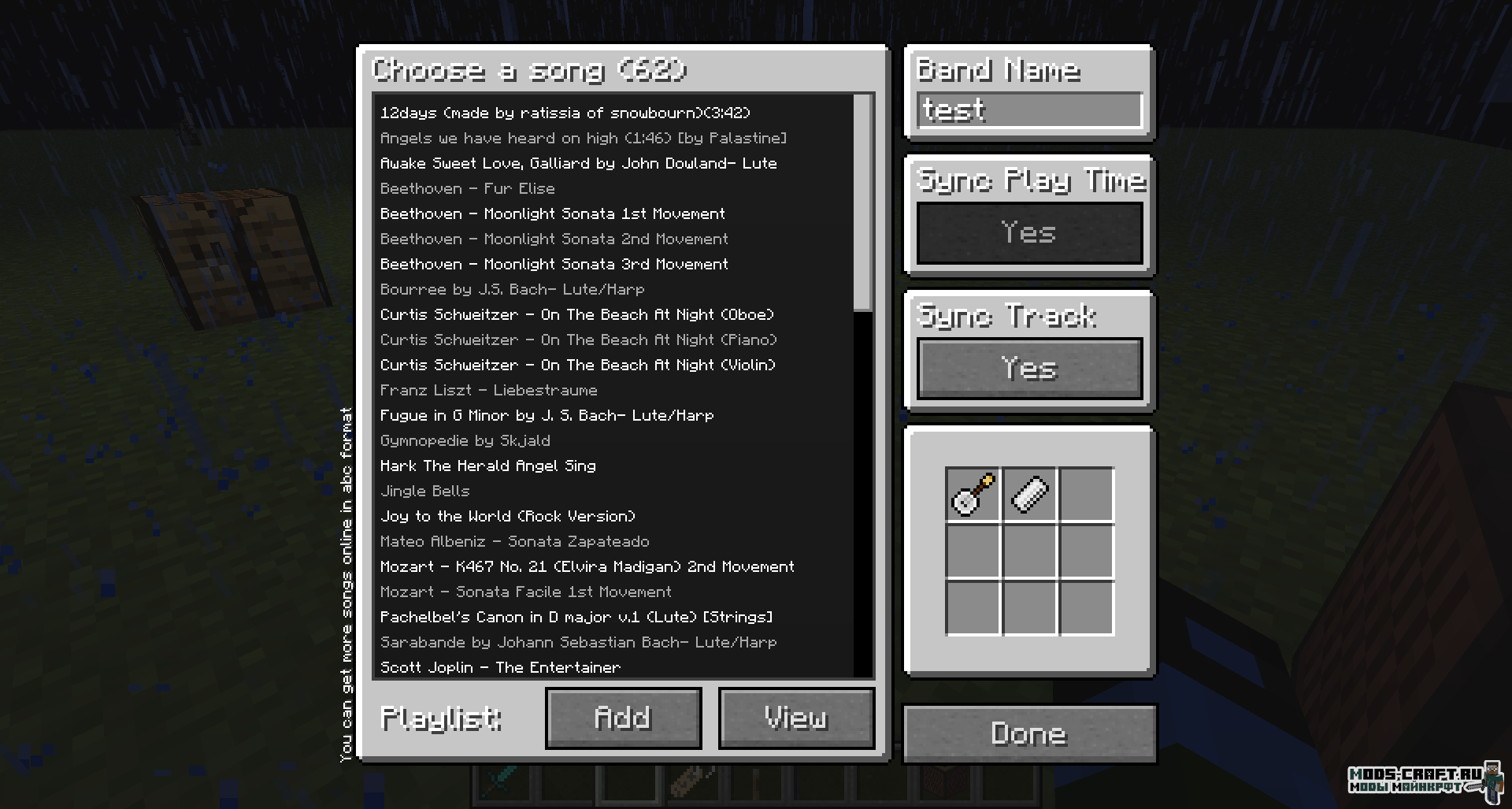 Мод Clef позволяет вам использовать 32 музыкальных инструмента для проигрывания музыки в формате ABC. Модификация считывает файлы формата ABC в папке /mods/clef/abc и инструменты в папке /mods/clef/instruments.
