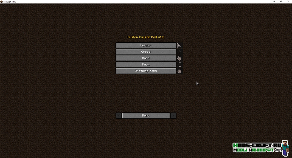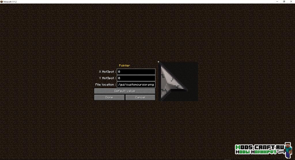 Мод позволяет изменять курсор игры Майнкрафт под свой, вам лишь нужно загрузить текстуру курсора в специальную папку и выбрать через меню. Текстуру нужно помещать по пути /assets/minecraft/textures/gui/ любого используемого вами ресурс-пака в виде изображения формата PNG.
