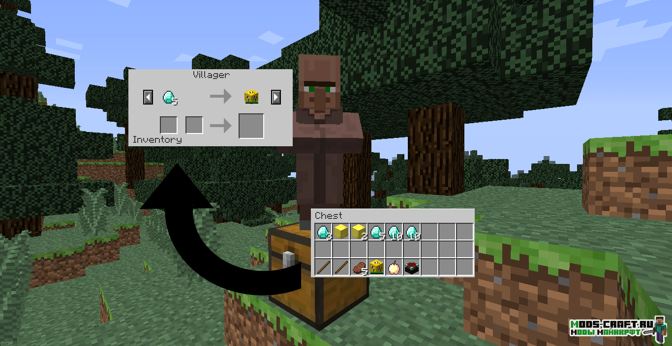 Мод изменяет систему торговли в Майнкрафт и теперь Вы сами можете определить, каким предметами обмениваться с жителем.