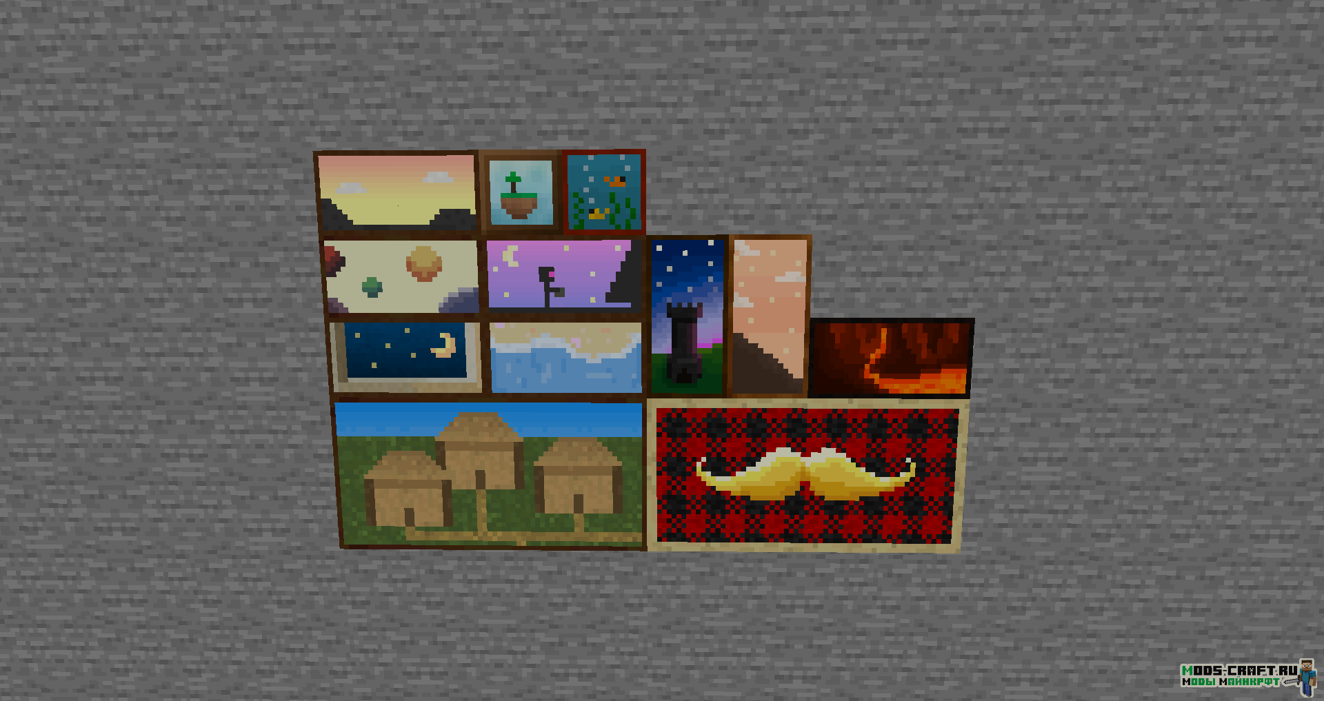 Мод Dark Paintings добавит большое количество пиксельных картин в Майнкрафт, написанных различными людьми. Они обладают ванильным стилем, поэтому без проблем впишутся в игру и интерьер вашего дома.