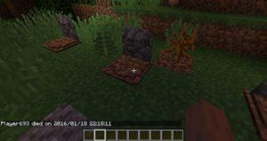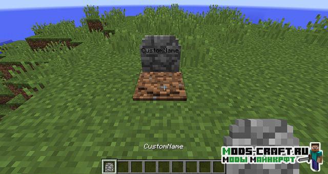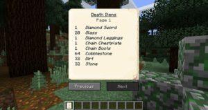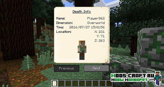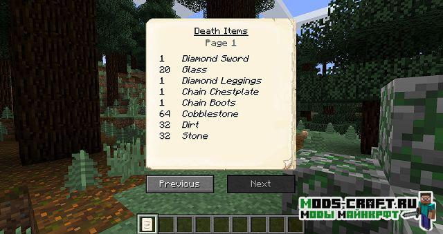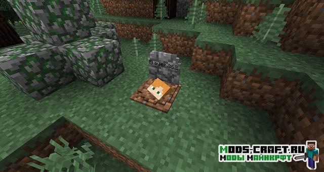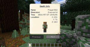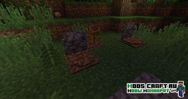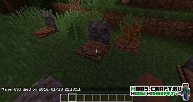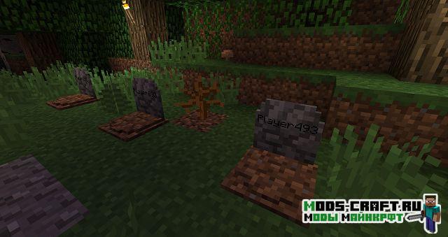 Теперь при смерти игрока на этом месте будет появляться могила, содержащая в себе инвентарь умершего и основную информацию о нём. Чтобы вернуть свои вещи, просто разбейте могилу. После смерти игроку будет выдан некролог с информацией о его последней смерти: имя игрока, измерение, дата, координаты, изображение игрока с его снаряжением в момент смерти, а также список всех утерянных предметов.