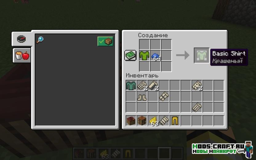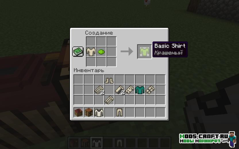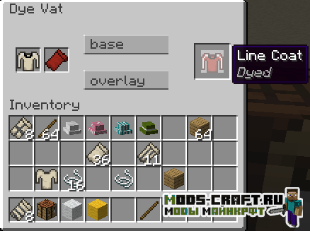 Для крафта основы одежды нам понадобиться блок clothinbg dye vat. Далее просто окрашиваем в верстаке с помощью красителя полученную одежду и получаем любой вариант цвета.