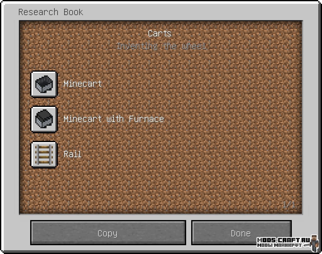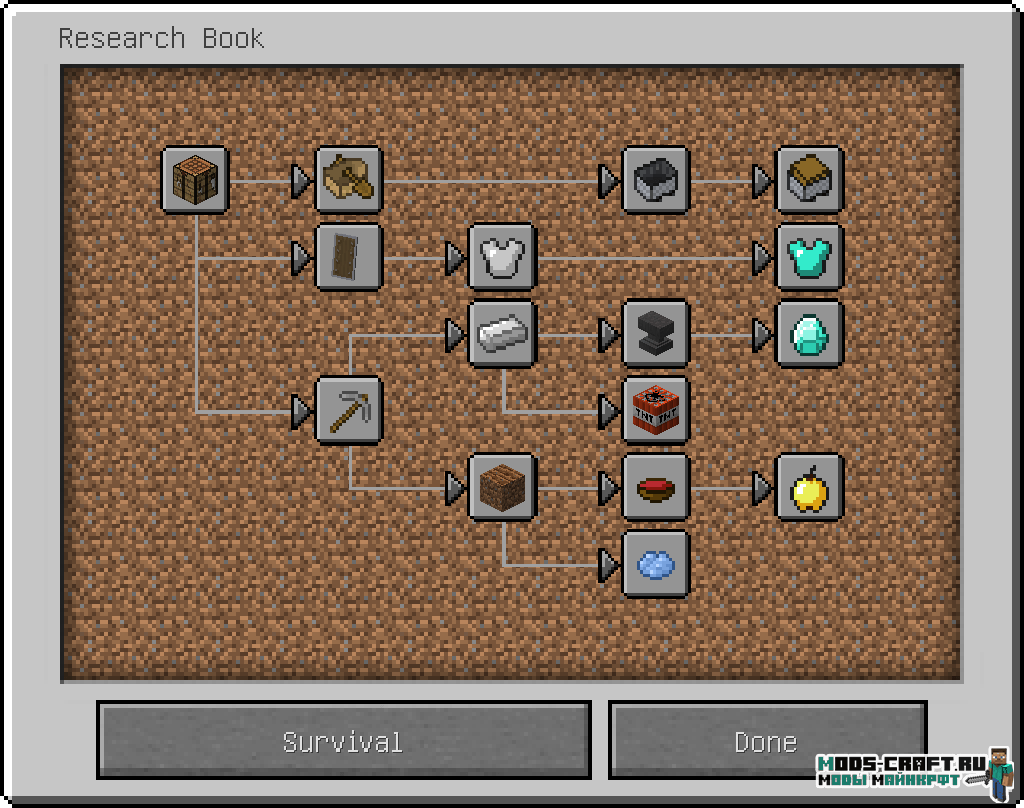 Данный мод добавляет систему исследования в игру Майнкрафт. Это связано с тем, что теперь чтобы создать какой-то определённый блок — вам необходимо изучить необходимую технологию. Это можно сделать с помощью пергамента и таблицы исследования предметов.