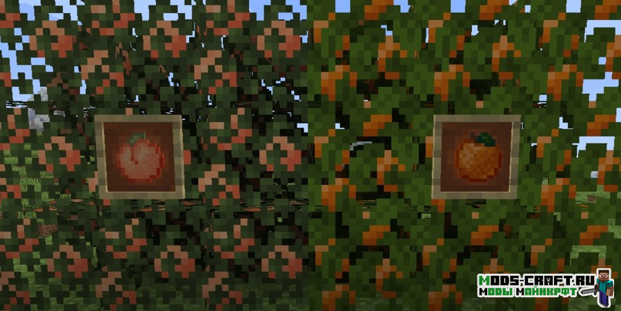 Этот небольшой мод полностью изменит привычную механику сбора фруктов в майнкрафте, изменив существующие яблоки и добавив новые виды фруктов. Теперь яблоки не будут выпадать из листвы, их нужно будет искать растущими на деревьях в лесу, так как это и должно быть! Так же появятся персики, растущие на березах и апельсины, растущие на деревьях в джунглях. Все фрукты могут быть использованы для приготовления новых блюд.