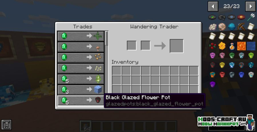 GlazedPots добавит в игру 16 вариантов глазированных горшков для цветов. Это эксклюзивный предмет странствующего торговца, поэтому горшки можно лишь купить у него. Странствующий торговец предложит вам один из 16 вариантов раскраски.