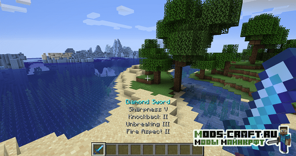 Мод добавит информацию о текущих зачарованиях на предмете, который находится в руках у вашего игрока. Выводится в виде списка над панелью хотбара.