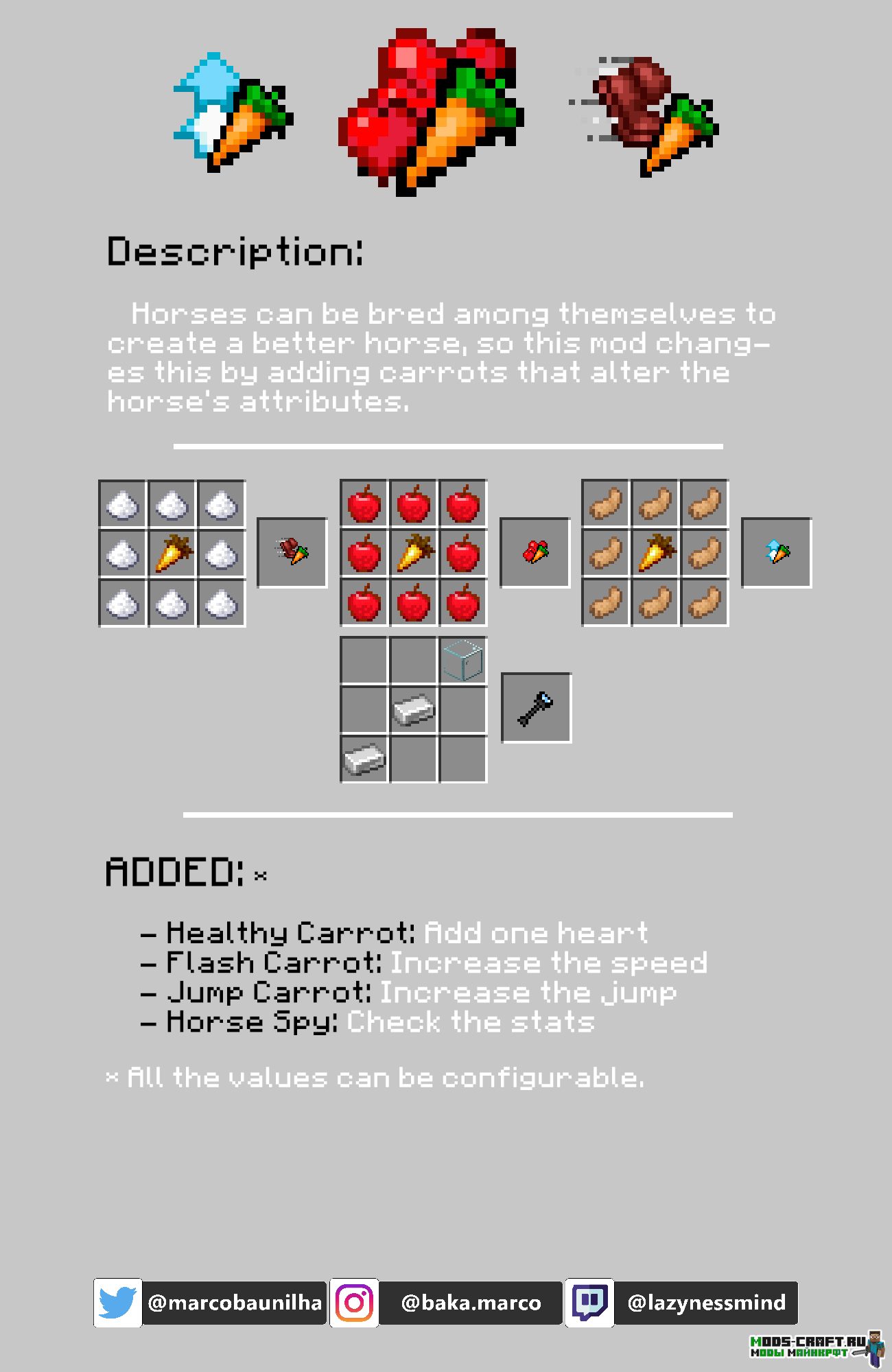 Мод Horse Modifiers добавляет специальные морковки, с помощью которых можно улучшить свою лошадь различными способностями. Например, дав лошади морковку с яблоком, её здоровье вырастит на 1 сердечко; морковь с сахаром увеличить скорость бега, а третья морковка увеличит высоту прыжка.
