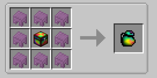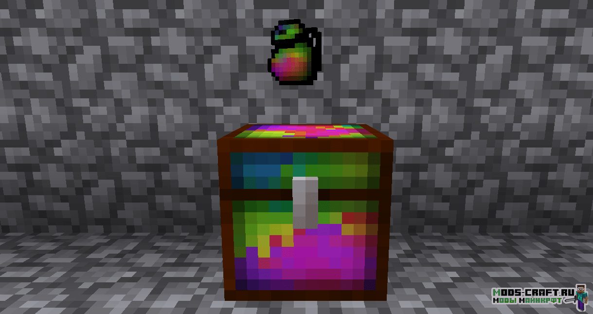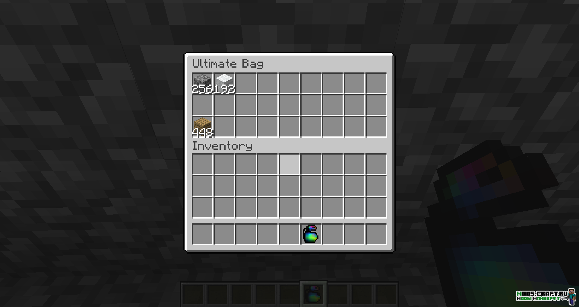 Мод добавит сумку и сундук, которые имеют 27 слотов для предметов, но способны вмещать в себя бесконечное количество стаков для одного типа блоков.