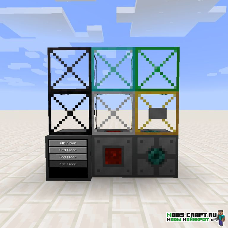 Мод Lifts позволит вам организовать быстрый и удобный лифт. Для его работы перед блоком управления необходимо установить платформу, которая будет перемещать объекты по вертикали. Также лифту необходимо обеспечить подачу энергии, например, можно это сделать при помощи сгорания угля или любого другого топлива и энергии. Платформой можно управлять с помощью редстоуна, кнопок подъема и экранов.
