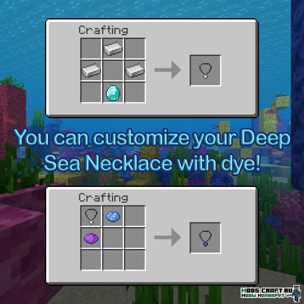 При помощи Mermaid Tail вы можете одеть новое ожерелья на себя и под водой у игрока появится хвост русалки, с которым будет удобнее плавать и нырять. С помощью красителей можно менять цвета хвоста, для этого поместите ожерелье и краситель в сетку крафта.
