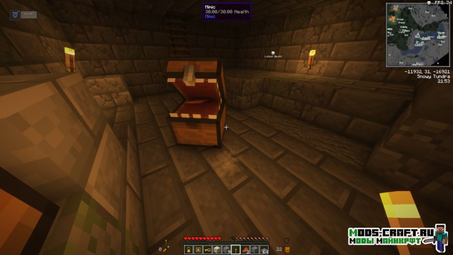 Мод Mimic был создан для улучшения большинства ванильных структур игры Майнкрафт, чтобы сделать их исследование более сложным и увлекательным. Всё дело в новых мобах — это мимики, они будут полностью схожи с сундуками и бездействуют до тех пор, пока не будет открыт игроком или атакован. Поскольку они содержат очень хороший лут, то наносят большой урон. Вам необходимо убить данного моба или заблокировать есть пасть при помощи специального замка, но если вы вынете из мимика все предметы, то он попытается взломать замок и напасть на вас. А при помощи мимического ключа вы сможете приручить мимика и он будет следовать за игроком как домашнее животное и может служить вам переносным хранилищем.