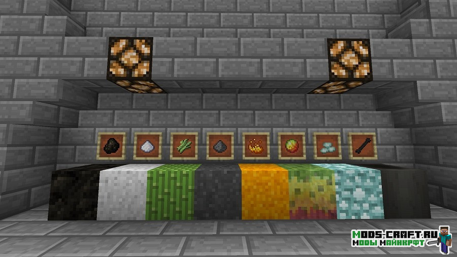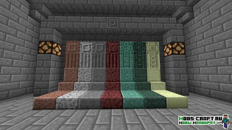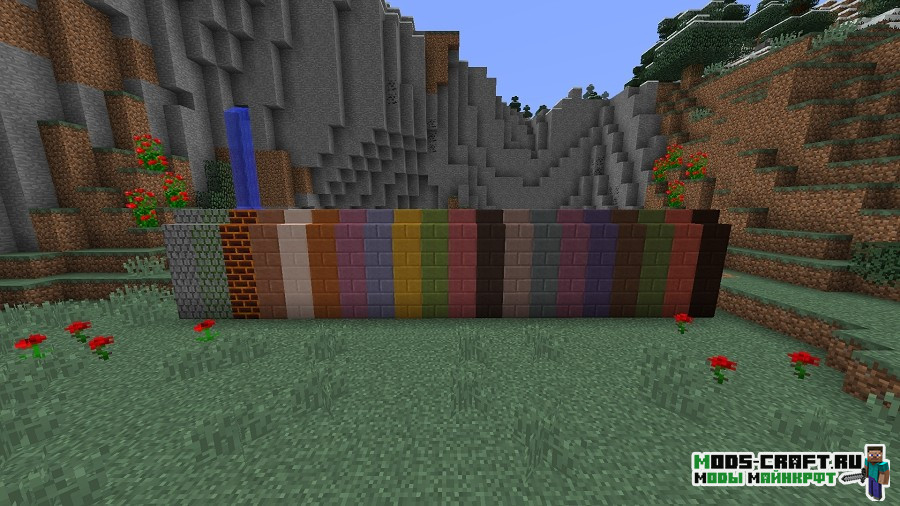 - Новые кирпичные варианты из блоков: булыжник, мшистый булыжник, терракота, магма блок, обсидиан, гравий и все окрашенные блоки.