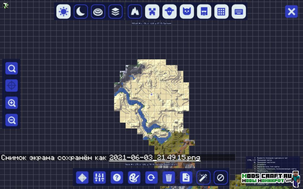 Под иконкой мини-карты будут отображены текущие координаты, а также название текущего биома. Если вы спуститесь в пещеру, то карта адаптируется под неё и отобразит карту пещеры. Вы можете открыть меню карты на клавишу J, чтобы установить путевые точки, телепорты, настроить размер мини-карты, иконки мобов и прочего.