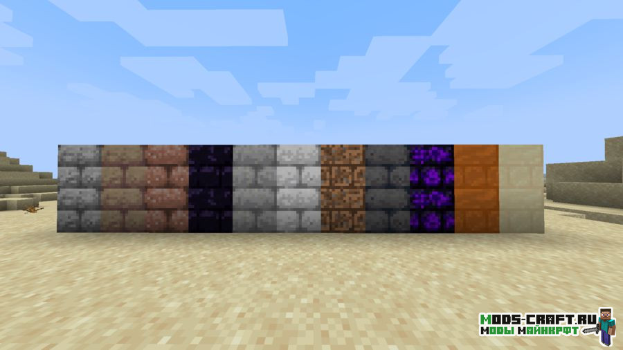 More Block Bricks — декоративный мод, добавляющий множество вариаций кирпичей в игру Майнкрафт! Причём всех их можно скрафтить из ванильных материалов.