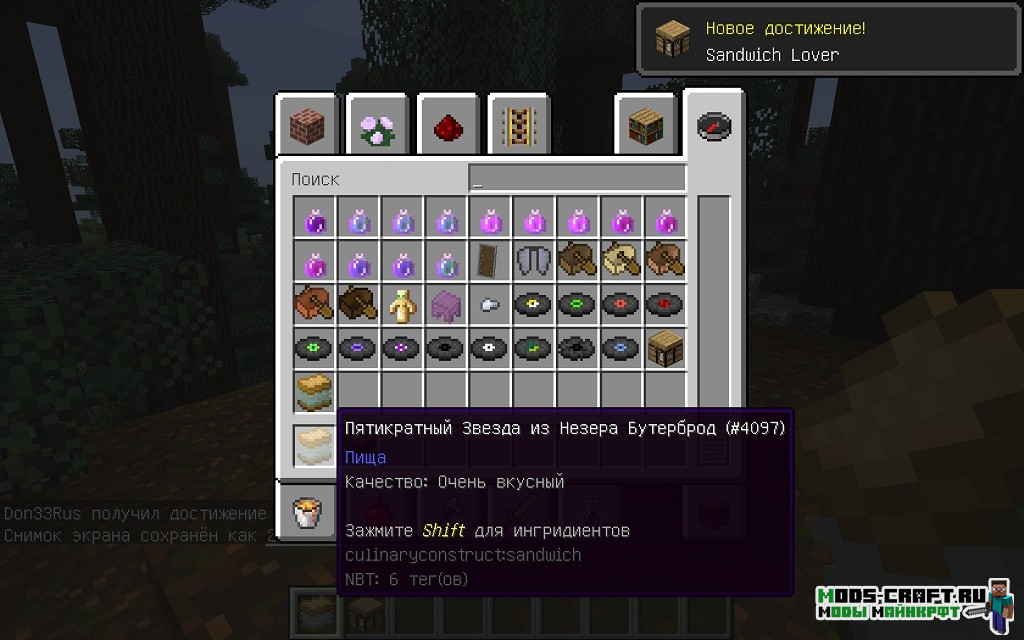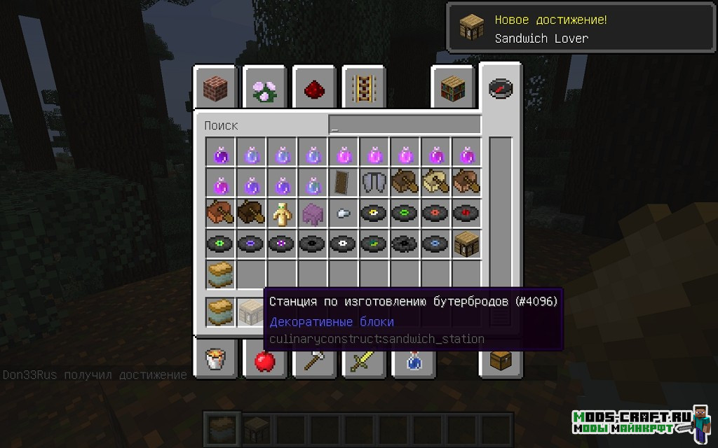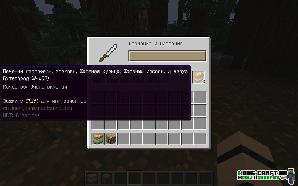 Мод Culinary Construct позволяет создать бутерброды в Майнкрафт практически из любого вида пищи. А делается это с помощью нового блока, похожего на верстак, где нужно положить в одну ячейку хлеб, а в другую одну или несколько единиц любой пищи. Чем больше будет продуктов в бутерброде, тем больше у него будет пищевой ценности.