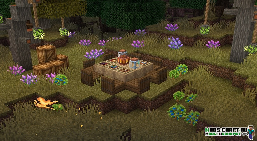 Помимо этого появится новый биом — тёмный лес с высокими деревьями. Там можно порубить этот новый лес и создать красивые декоративные предметы для дома. Следим за дальнейшим развитием мода, многообещающий проект. По словам автора он добавит ещё очень много сюда.