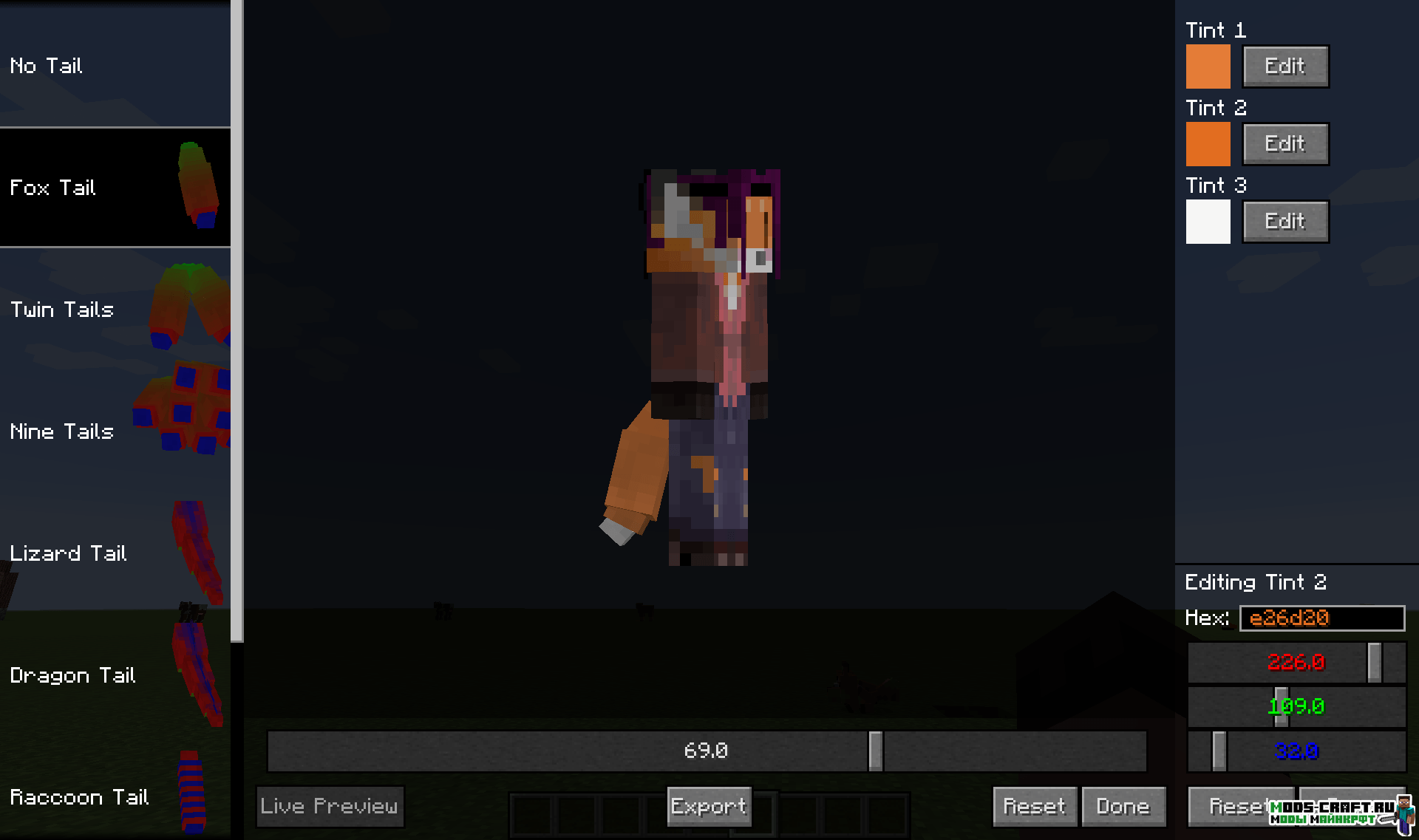 Мод позволит добавить вашему персонажу хвост, причём выбрать его можно из огромной коллекции или сделать самому.