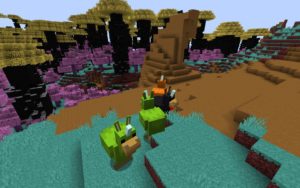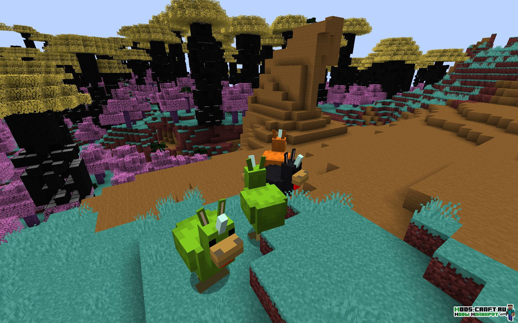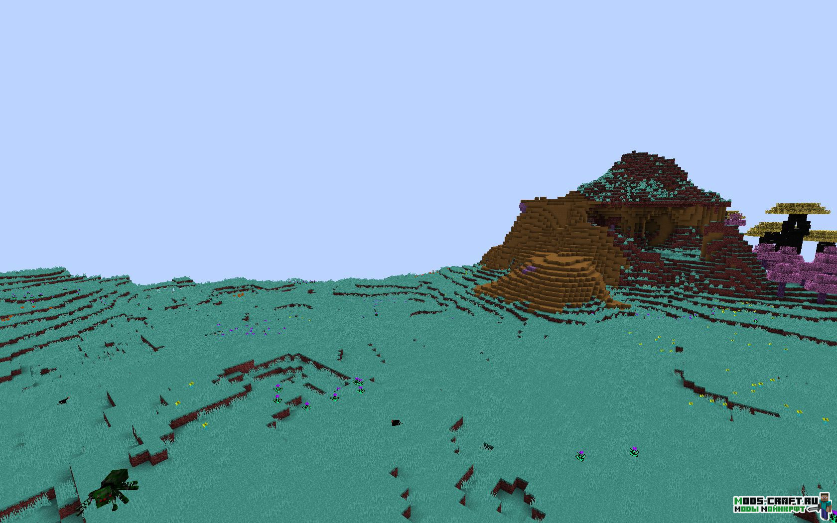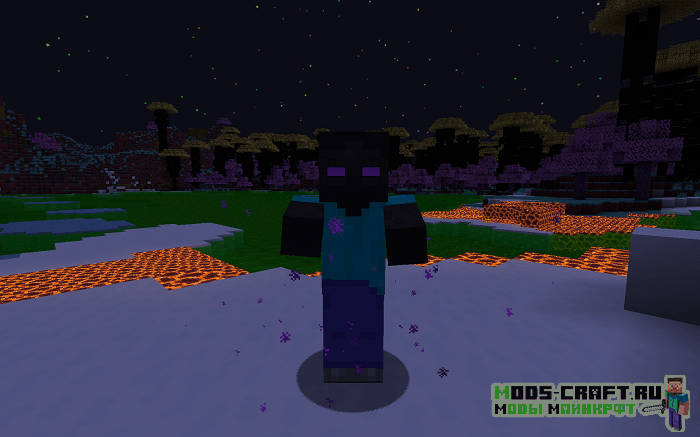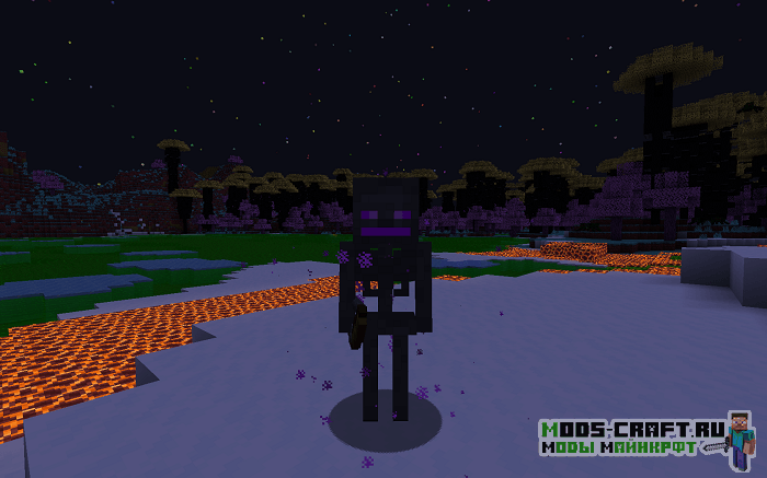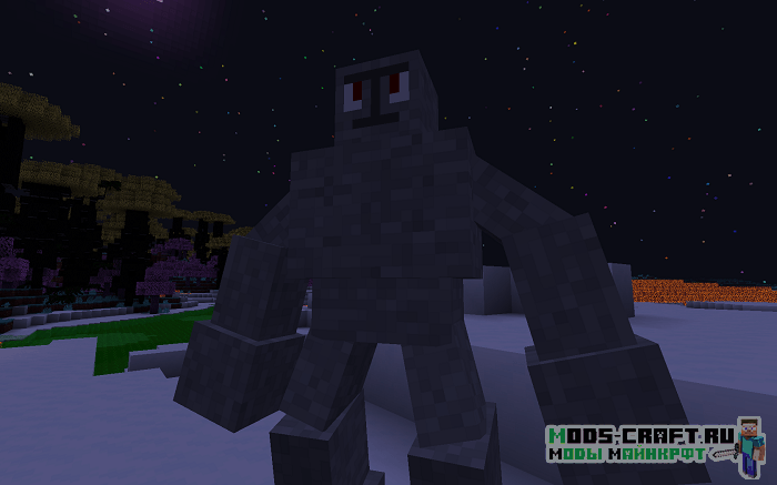 Оказавшись в новом мире мы можем увидеть отличительный ландшафт и новую цветовую гамму, растения, биомы и мобов. Последних кстати я вам сейчас продемонстрирую — это новый зомби, скелет, какой-то магический шар, каменный голем и водное существо. Примечательно ещё то, что некоторые мобы будут получать урон от дождя — продемонстрировал на последнем скриншоте как скелет умирает от дождя.