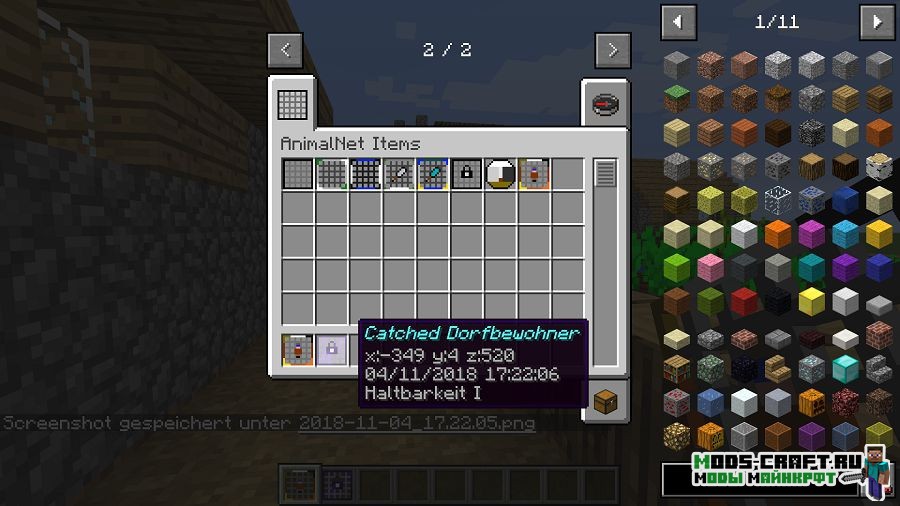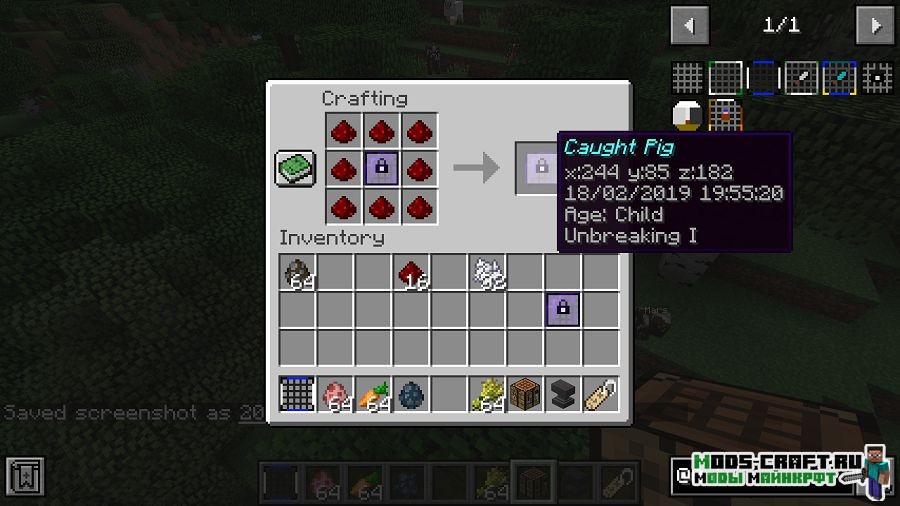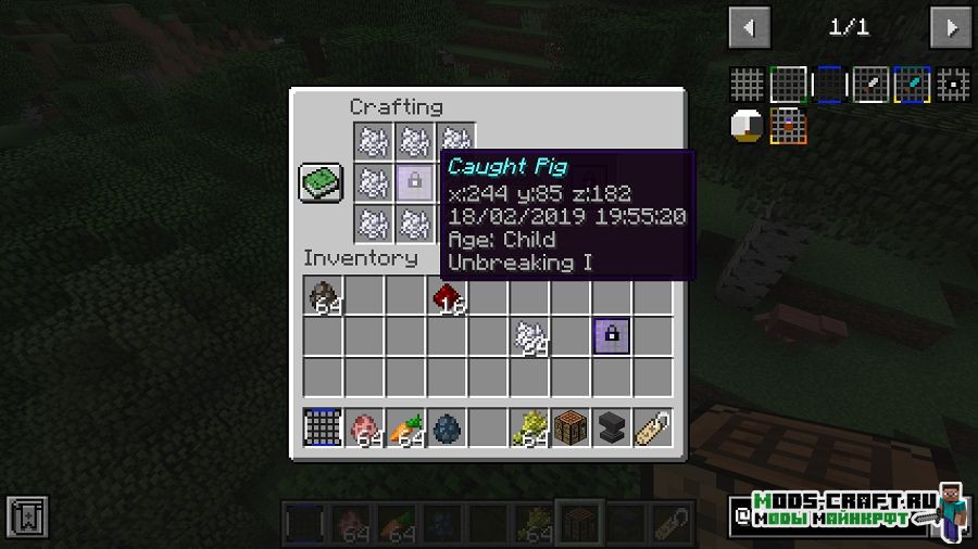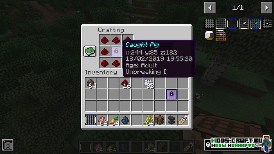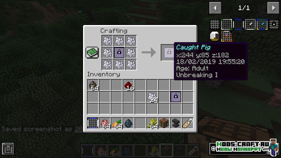 Мод AnimalNet добавит сети, с помощью которых можно ловить мобов. причём, чем больше моб, тем больше требуется сделать сеть, иначе она не выдержит. Пойманные мобы в сети будут сохранять свой возраст, называние и особенность.