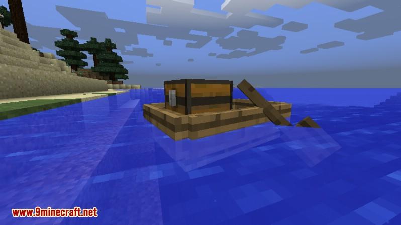 Мод добавит специальную лодку, в которой будет сундук и вёсла для гребли. Вместимость сундука 27 слотов стаков.