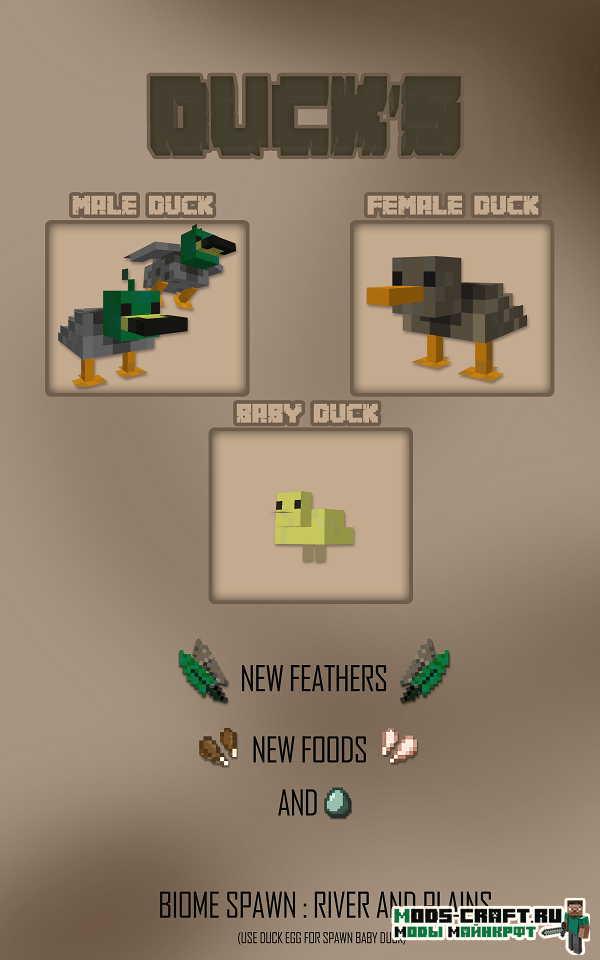 Мод добавляет милых уток в мир Майнкрафт, которые отлично впишутся в ванильную стилистику игры. Они будут откладывать яйца каждые 5 минут, а утиные перья вы можете использовать для изготовления стрел. Также появятся новые виды утиного мяса для употребления.
