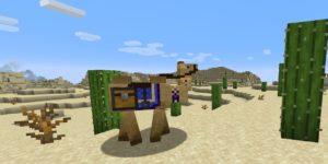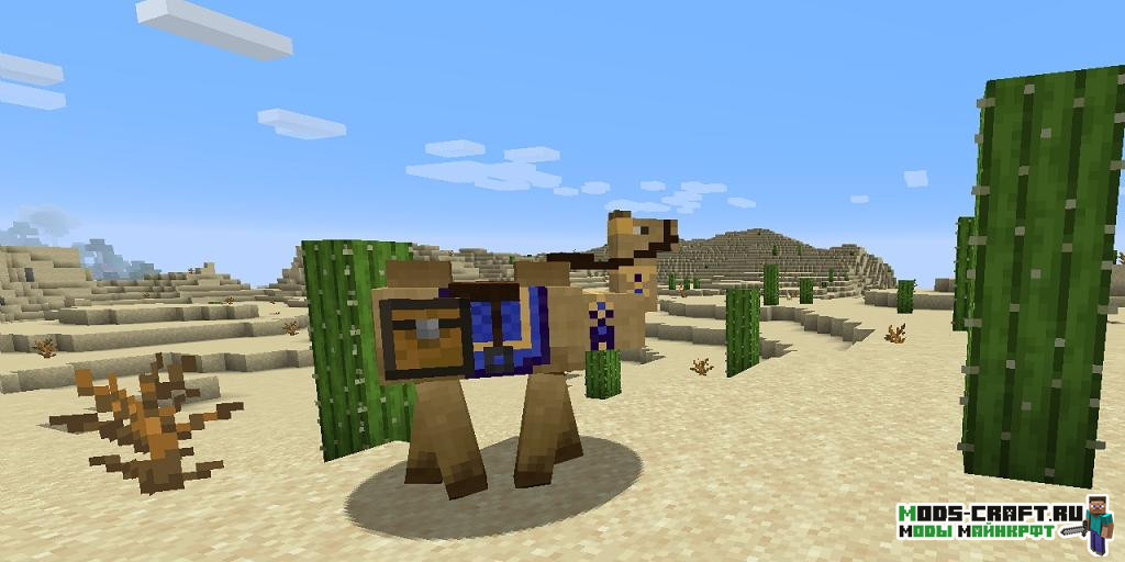 Мод добавляет в пустынные биомы нового обитателя — верблюда. Он приручается также как и лошадь, может нести больше предметов чем ламы, обладает высокой прочностью и здоровьем, но небольшой скоростью передвижения. вы сможете украсить его разноцветными коврами, также автор сделал ему уникальный звук.