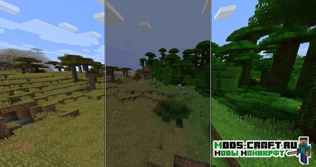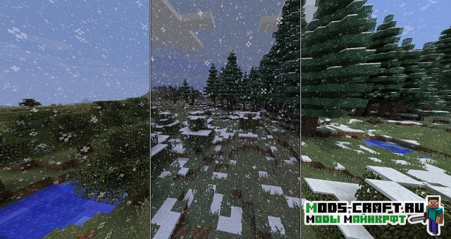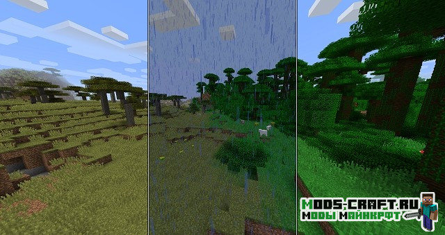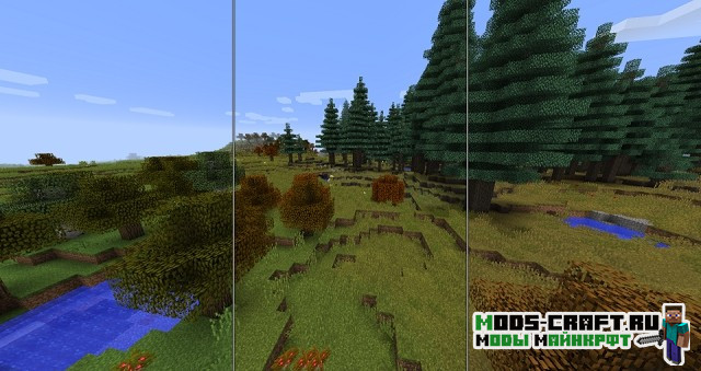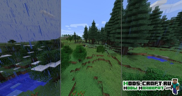 Теперь в игре Майнкрафт будет плавно меняться погода и времена года. Вы сможете наблюдать как меняется природа и лето сменяется на осень, зиму и весну. Растительность, цветы и окружающий мир — всё вокруг будет меняться с течением времени. Также это будет влиять на ваш урожай, например, зимой не будут расти некоторые культуры. Да и к тому же, осенью будет очень влажно и часто будут идти дожди, а летом иногда может быть засуха.