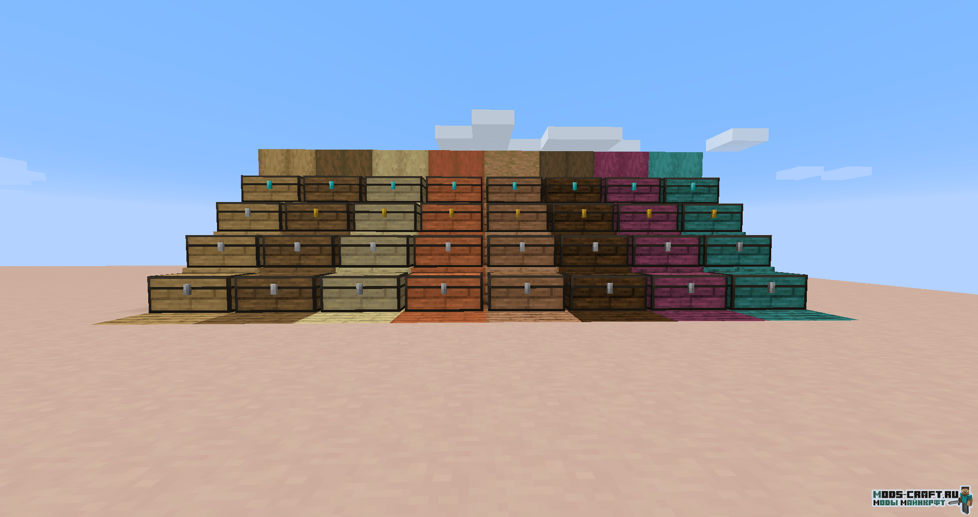 Packed Storage — это мод, который добавляет различные блоки для хранения, среди них сундуки, бочки и ящики. Все эти хранилища имеют уровни и улучшения на вместимость для предметов. Каждый апгрейд сундука увеличивает вместимость на 9 слотов, а ящики имеют возможность хранить лишь один тип предмета.