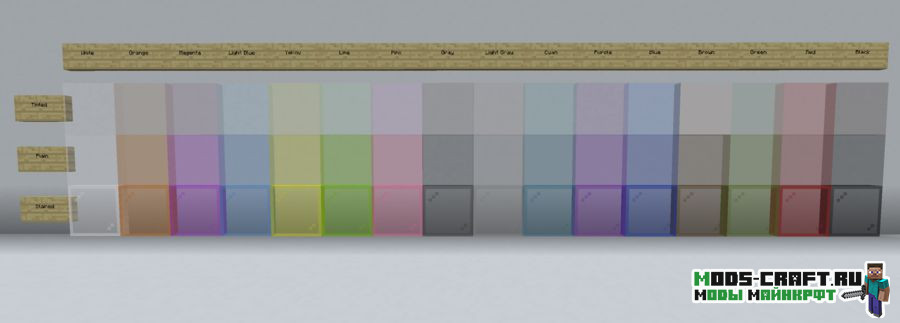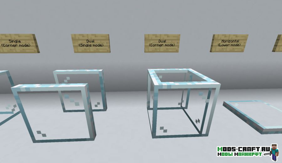 Pane In The Glass — небольшой декоративный мод, добавляющий стеклянные панели. Они отличаются от ванильных тем, что могут быть размещены по краям блока, а не по центру. Новые стеклянные панели могут быть трёх видов — одинарные, двойные и горизонтальные. Также их можно покрасить в разные цвета (всего доступно 32 варианта цветов). Это привнесёт новые возможности в декорирование ваших построек и добавит немного эстетики.