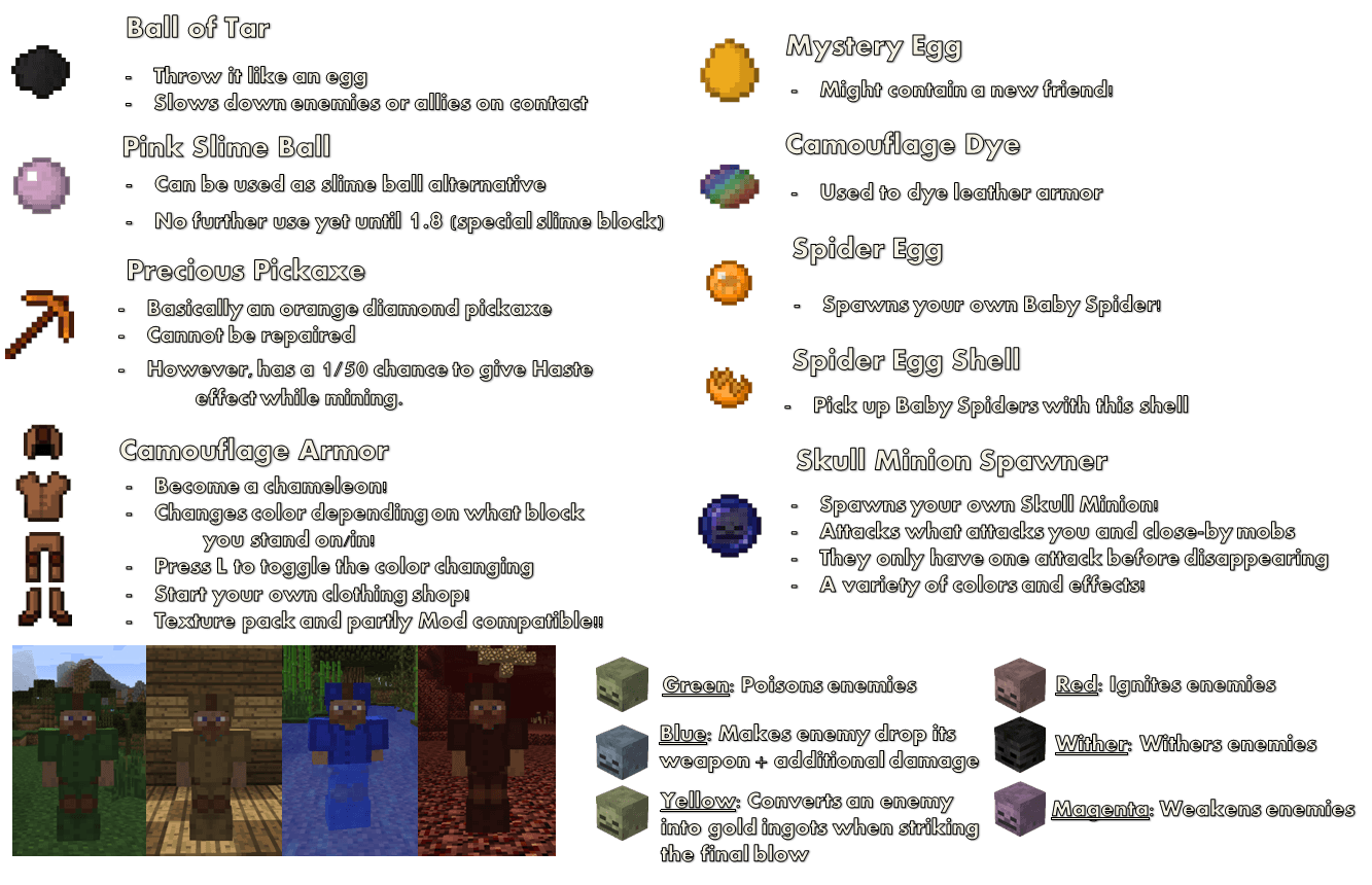 Мод добавит множество новых мобов, которые будут очень умные за счёт нового искусственного интеллекта. Также появятся мобы из других старых и забытых модов или других игровых вселенных, новые игровые предметы, сеты брони, оружие и пару инструментов. В видео подробно разобрано каждое существо и предметы модификации.
