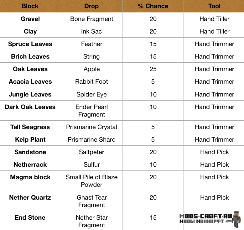 Мод Resourceful Tools добавляет набор дополнительных инструментов в игру, которые будут полезны в определённых ситуациях. Например, если использовать Hand Tiller из гравия можно получать дополнительно кости, а с Hand Trimmer из листьев получить яблоки, нитки и перо. В общем, они увеличивают дроп на тех блоках, которые были для этого предназначены.