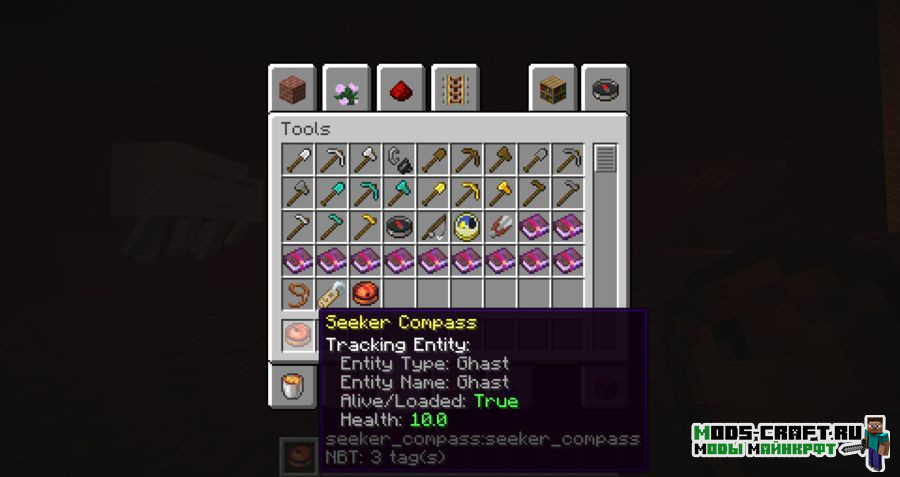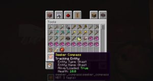 Seeker Compass — это мод, добавляющий в игру специальный компас для отслеживания сущностей игры. Он способен отслеживать любое живое существо и даже игроков, и отлично подходит для перемещения потерянных животных или поиска вашего друга при совместном выживании. При помощи нажатия ПКМ с компасом в руке на выбранное существо, вы будете отслеживать его. Во время отслеживания компас тратит свою прочность каждую секунду и при достижении значения прочности «1» сломается. Полное время работы компаса при отслеживании составляет 20 минут, а отремонтировать его можно при помощи наковальни и лавового крема.