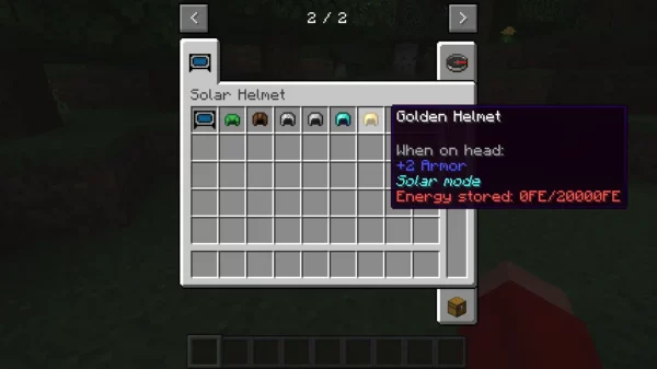 Solar Helmet добавит в игру модуль солнечного шлема, который может быть применён к любому шлему. При ношении шлема с модулем он будет вырабатывать от солнца Forge-энергию. Эта энергия, в свою очередь, может быть использована лишь на предметах, которые потребляют данную энергию в инвентаре игрока, например, аккумулятор.