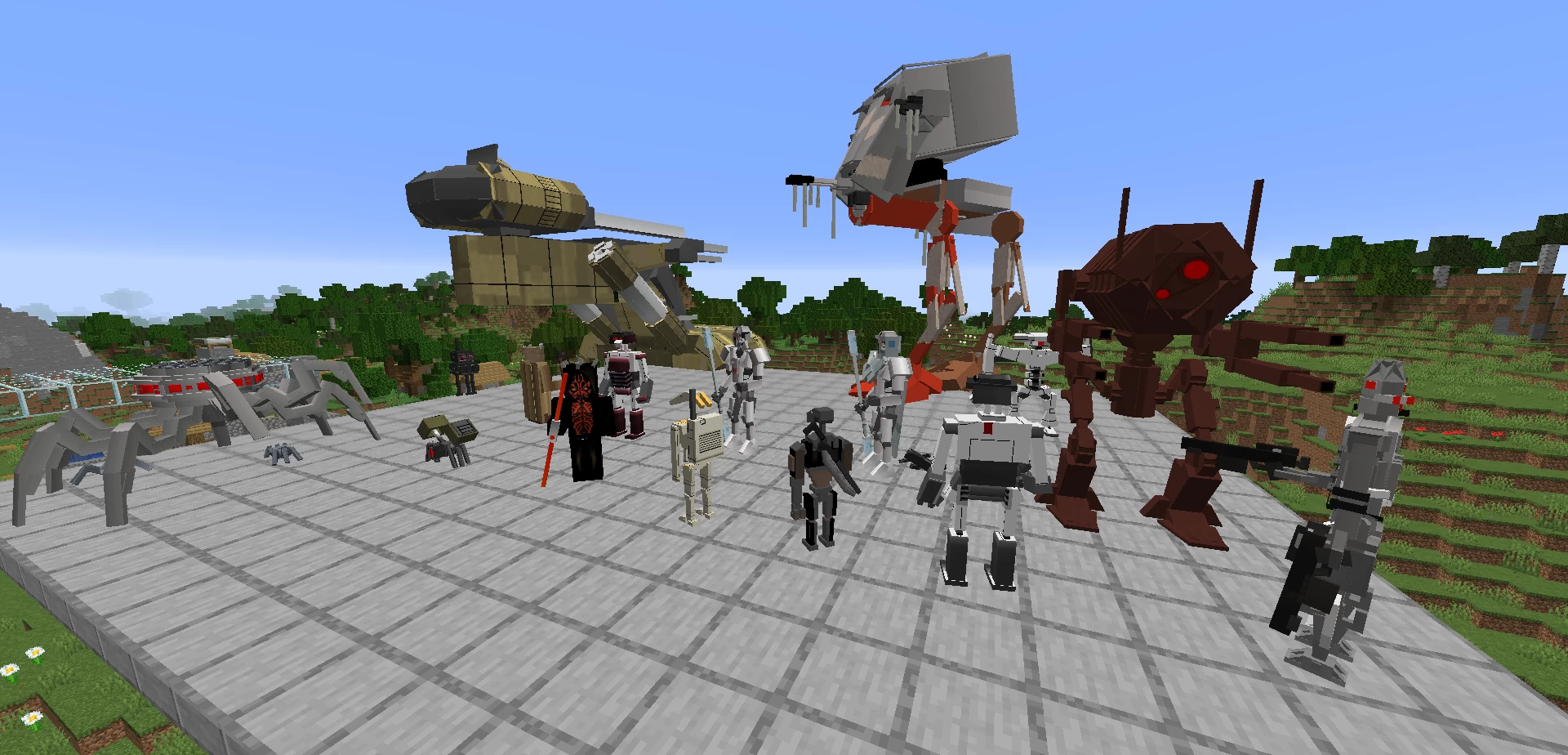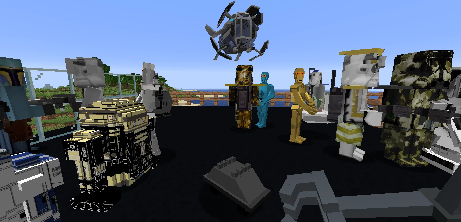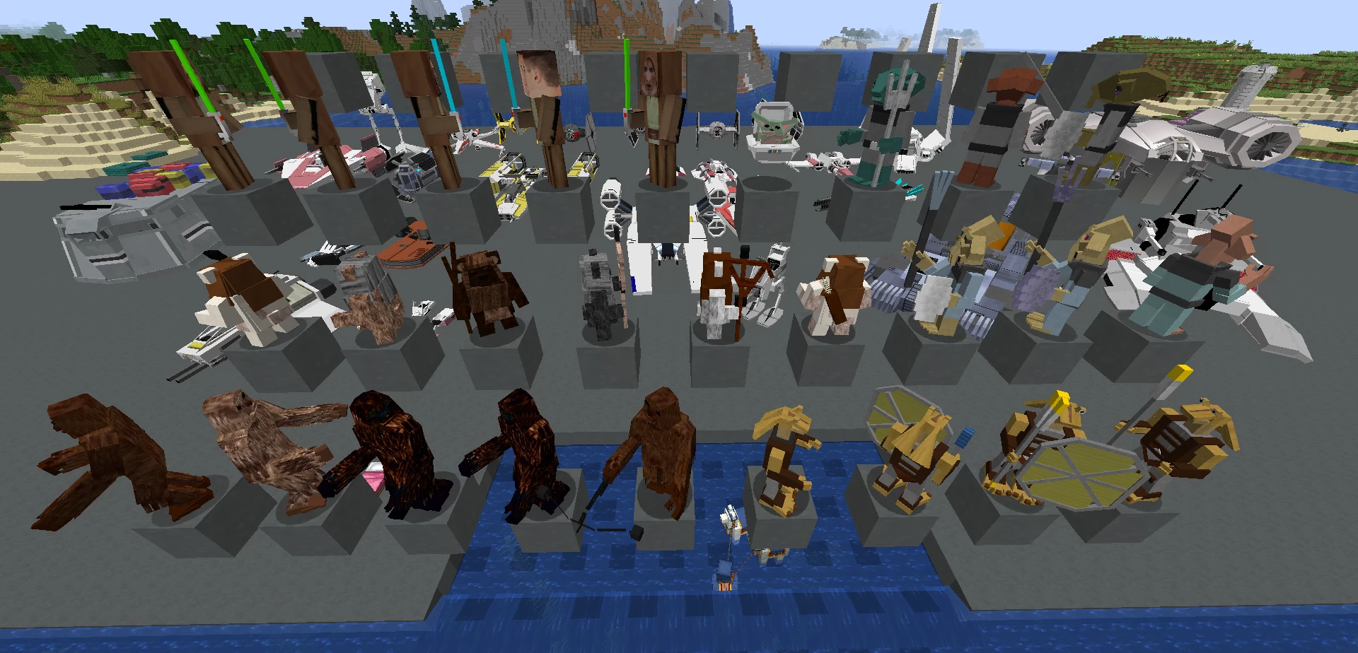 Мод Star Wars Mobs добавляет множество мобов и машин из известной вселенной «звёздные войны». Вы сможете пострелять из бластеров некоторых космических кораблей и летать на них, для стрельбы используйте клавиши R или F в зависимости от крепления оружия. Среди мобов вы можете приручить солдат клонов, а не ездовых животных открывать их инвентарь.