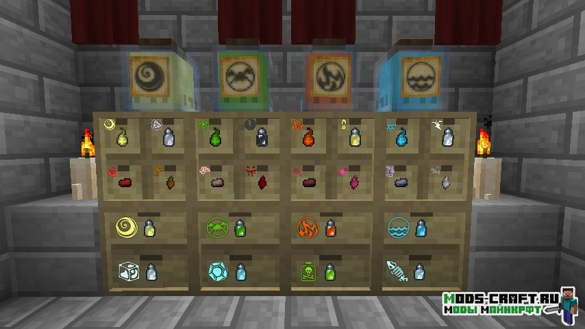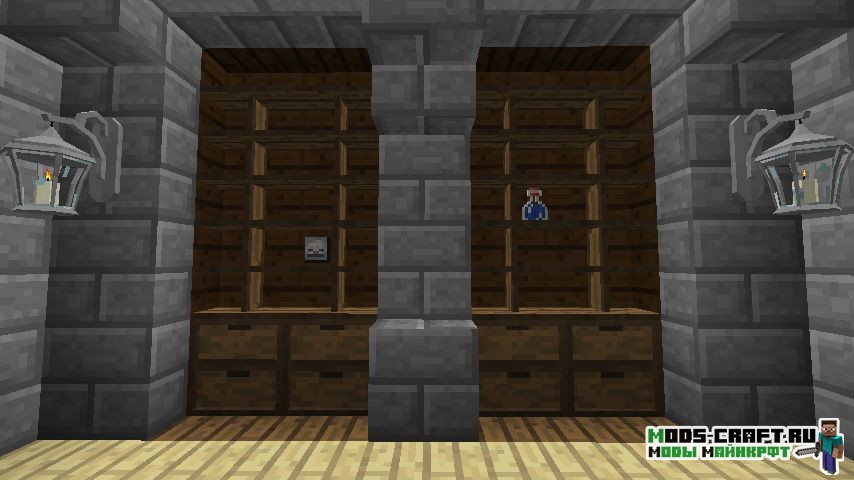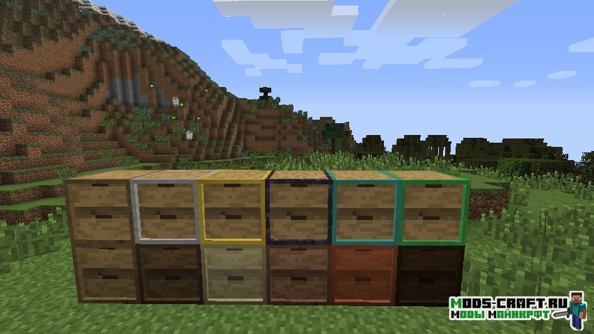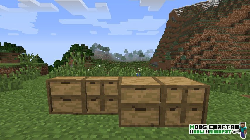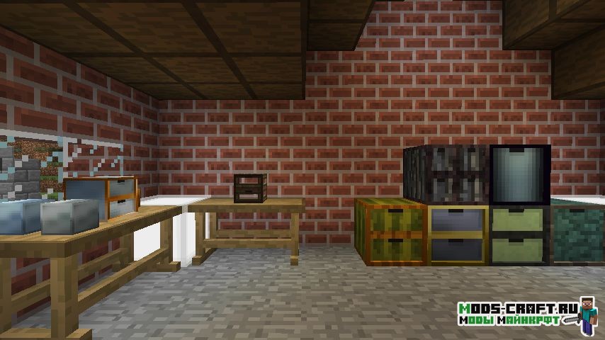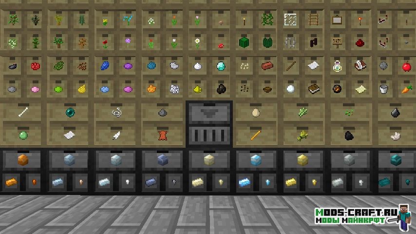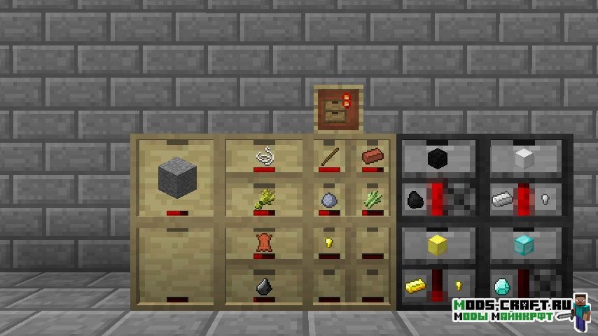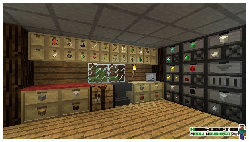Мод Storage Drawers добавит новые и довольно интересные хранилища для предметов в виде ящиков, полок, шкафов и прочего. Причём предметы хранятся в непривычном виде для игроков, их нужно положить взяв предмет в руку и нажать на правую кнопку мышки. А чтобы забрать предмет обратно, кликнуть по нему левой клавишей мышки.