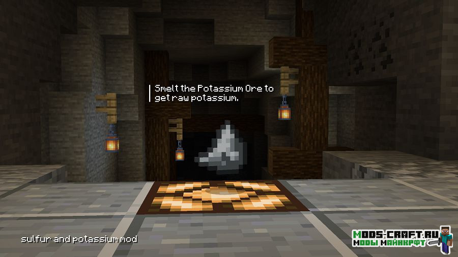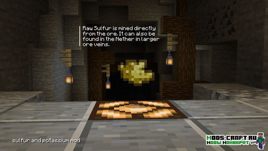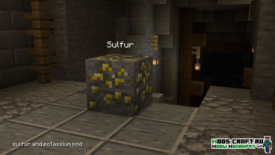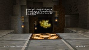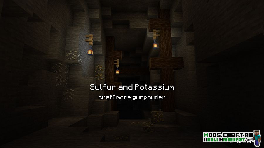 Данный мод добавит две новые руды — калиевую и серную, объединение которых позволит получить порох. Тем самым вы сможете вполне легально создавать порох не прибегаю к долгим поискам структур и убийствам мобов. Серная руда может быть найдена в обычном и нижнем мире, а калиевая только в нижнем мире.