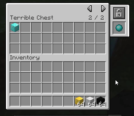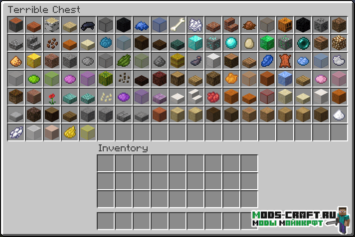 Мод Terrible Chest добавляет почти бесконечный сундук, содержащий в себе много страниц по 27 слотов, и в каждый такой слот вмещается 4.3 миллиарда предметов. При помощи нехитрых манипуляций можно сделать сундук доступный только вам по аналогии эндер-сундука. Также здесь есть пара полезных команд по сортировке и перемещению предметов, они будут описаны ниже.