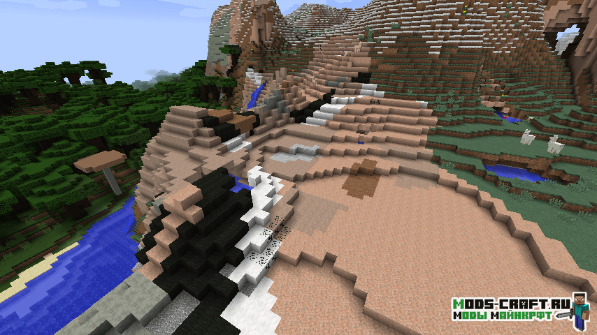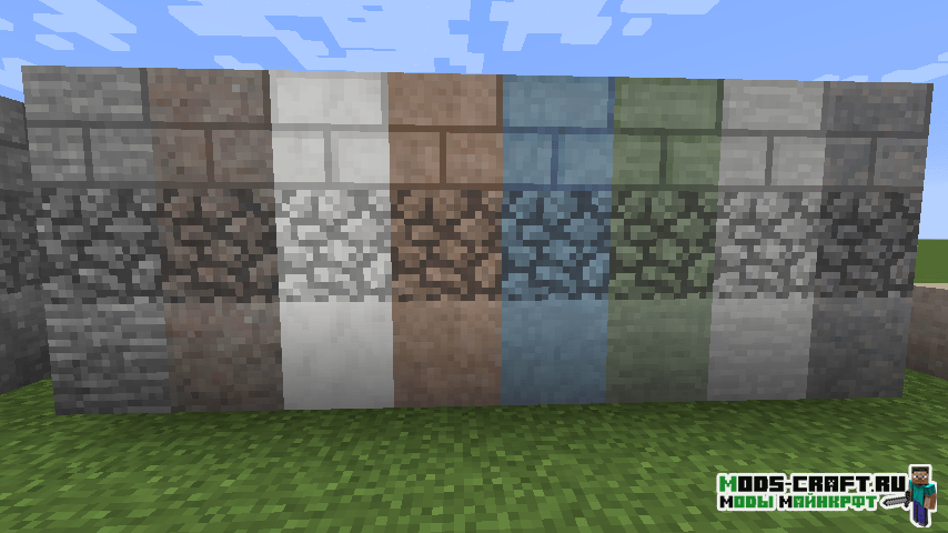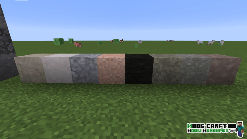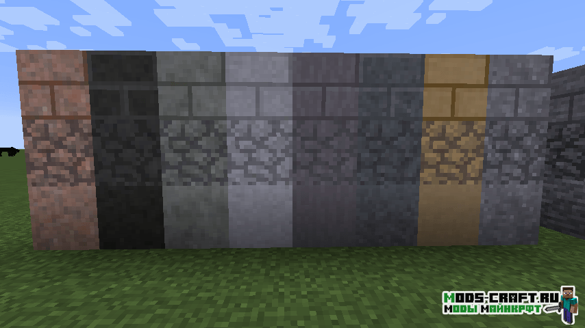 Мод Underground Biomes Constructs добавит 24 вида камня, 16 видов булыжника, кирпичей, лестниц, кнопок, стен и плит. Кроме этого измениться генерация подземных блоков, в частности теперь будет три вида осадочных пород: осадочные, метаморфические и магматические.