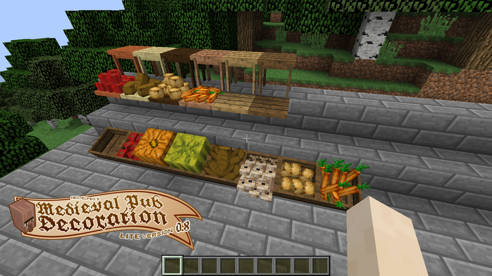 Мод включает в себя широкий спектр декоративных элементов, таких как камни, кусты, винные бутылки, ящики с фруктами, винные погреба, подставки для горелок и многие другие интересные предметы, которые можно использовать для улучшения общей атмосферы трактира.